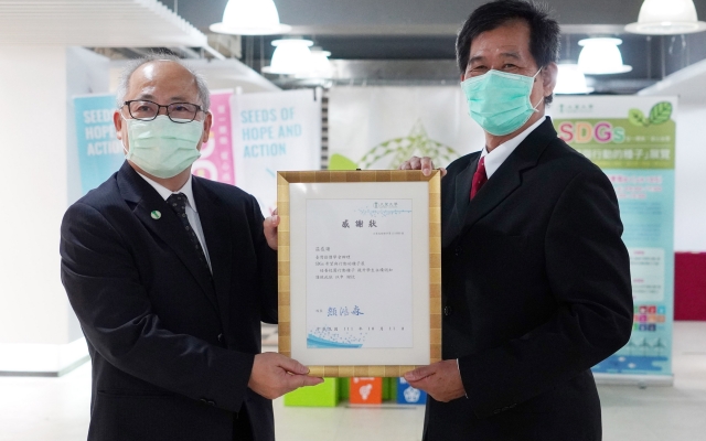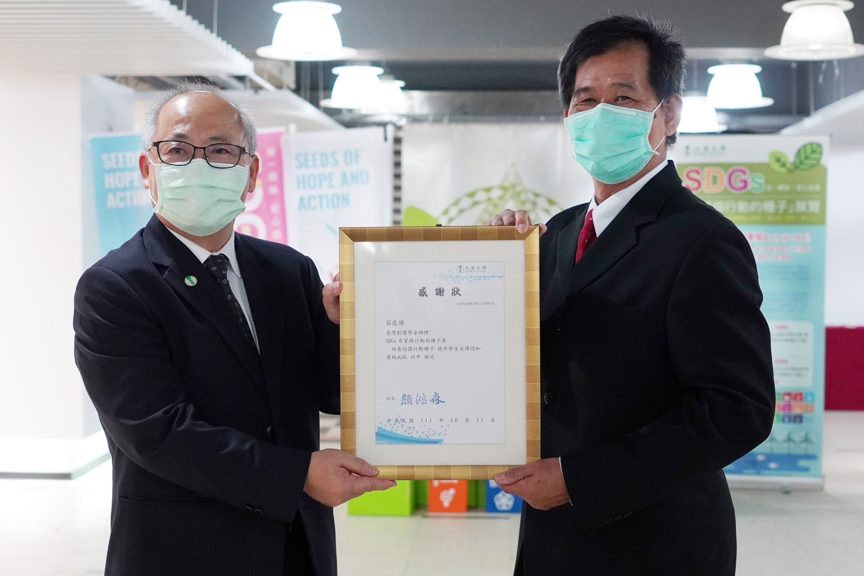 原聲原社熱情的舞蹈表演為展覽活動揭開序幕,施英隆副校長代表學校致贈感謝狀,感謝台灣創價學會共同推廣SDGs。施英隆副校長表示,大葉大學獲評為全國私校第一的綠色大學,以永續的綠色大學為辦學願景,今年更是榮獲教育部111年度永續循環校園示範計畫補助,學校也集結跨領域師資團隊,成立「產業淨零碳排輔導團」,協助產業因應政府「2050淨零排放」目標,邁向永續願景。台灣創價學會一直致力於和平、文化、教育的推廣,今年特別響應聯合國永續發展目標SDGs,舉辦「SDGs × 希望與行動的種子」展覽,把永續的種子散播到校園,大葉大學也培訓了30位大學生擔任此次的導覽志工,帶領更多人一起來了解SDGs。