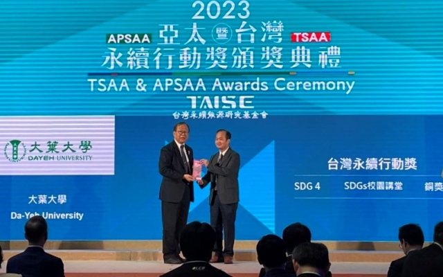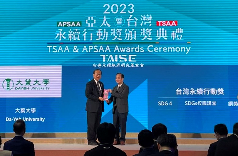 亞太永續博覽會今(21日)下午舉辦台灣永續行動獎頒獎典禮,大葉大學積極推動永續發展,鏈結聯合國永續發展指標SDGs,打造校園成為實踐場域,在校園講堂就能學習綠色知識,這項促進社會共融的「SDGs校園講堂」計畫,榮獲台灣永續能源研究基金會「2023第三屆TSAA台灣永續行動獎」SDG4「教育品質」銅級。