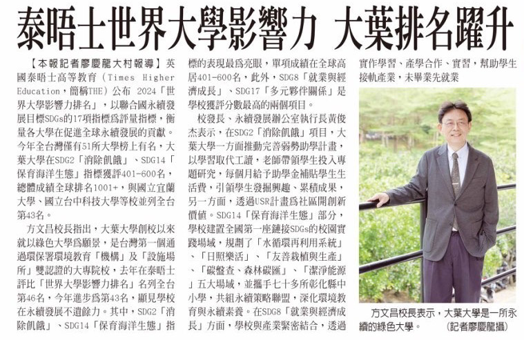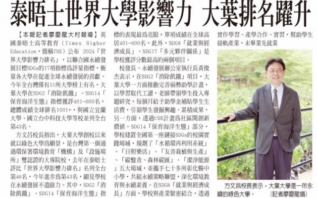 泰晤士世界大學影響力 大葉排名躍升
