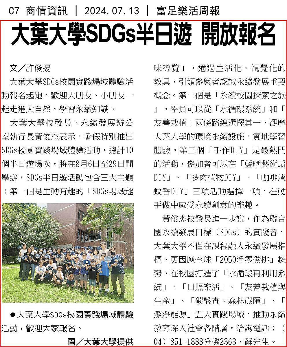 大葉大學校發長、永續發展辦公室執行長黃俊杰表示,暑假特別推出SDGs校園實踐場域體驗活動,總計10個半日遊場次,將在8月6日至29日間舉辦,SDGs半日遊活動包含三大主題:第一個是生動有趣的「SDGs場域趣味導覽」,通過生活化、視覺化的教具,引領參與者認識永續發展重要概念。第二個是「永續校園探索之旅」,學員可以從「水循環系統」和「友善栽植」兩條路線選擇其一,觀摩大葉大學的環境永續設施,實地學習體驗。第三個「手作DIY」是最熱門的活動,參加者可以在「藍晒藝術扇DIY」、「多肉植物DIY」、「咖啡渣蚊香DIY」三項活動選擇一項,在動手做中感受永續創意的樂趣。